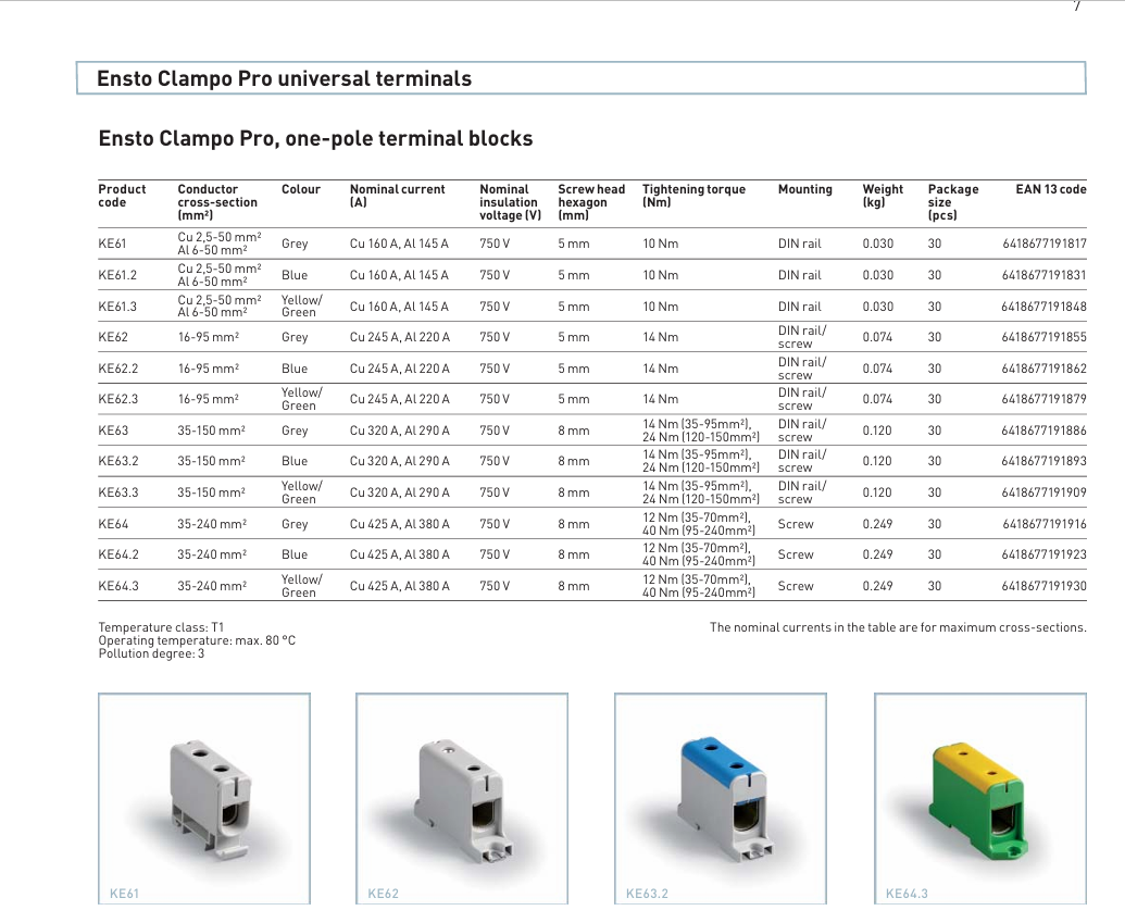 | Clampo Compact 紧凑型 | 1.5-35mm² | 17.5-135A | 450-750V | 铜 | 尼龙 + 镀镍黄铜 | 仪器仪表、自动化控制 |